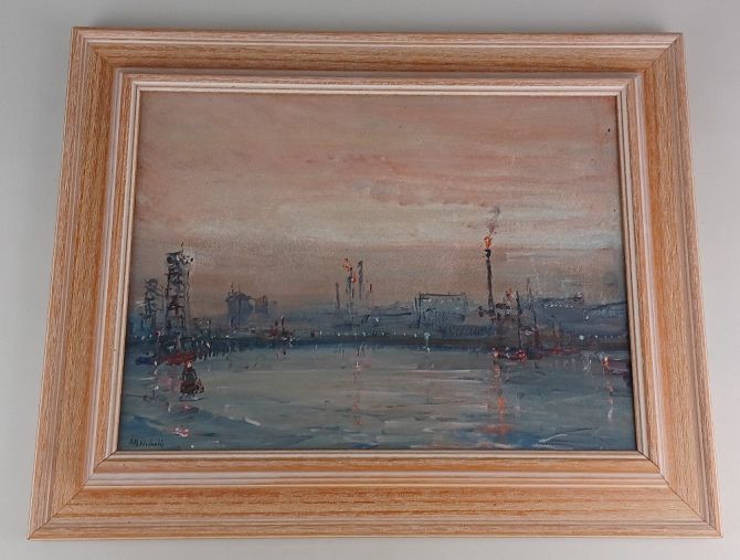 A G Nicholls, harbour view at sunset, oil on canvas board, signed, 28cm by 39cm