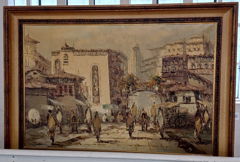 Jim (20th century), continental street scene, oil on canvas, signed, 58cm by 88cm (a/f)