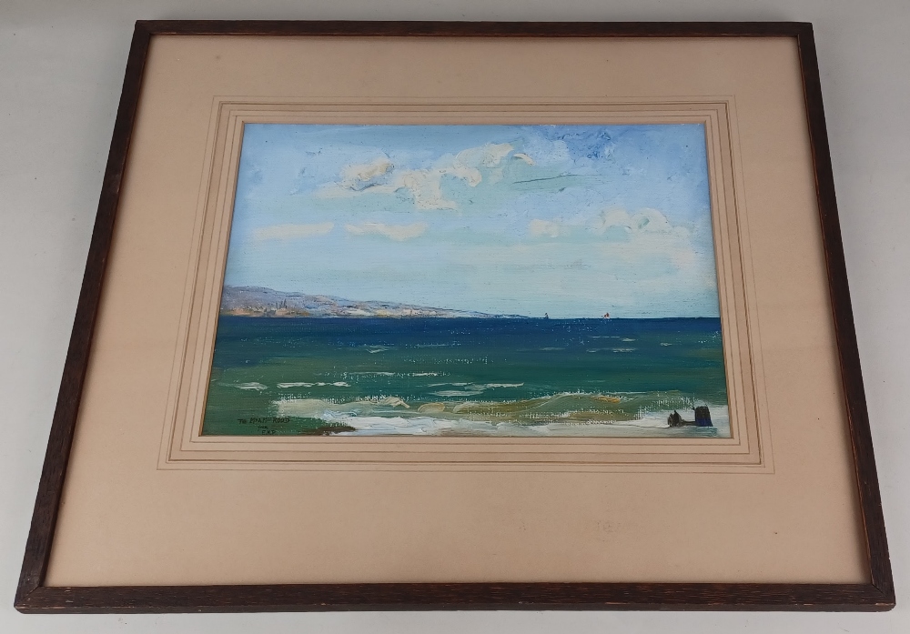 Edward Holroyd Pearce (1901-1990), view across calm seas towards a distant coastline, oil on board, inscribed 'To Mr & Mrs Rood from EHP', 24cm by 33cm