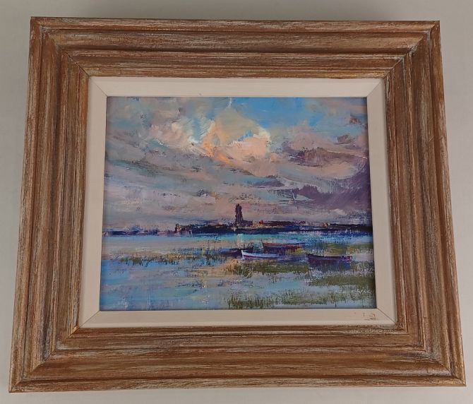 20th century school, 'Sunset over Hurst Castle', Hampshire, oil on board, unsigned, verso inscribed, the frame indistinctly signed S Green?, 21cm by 26cm