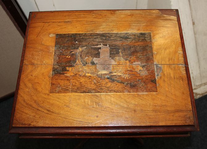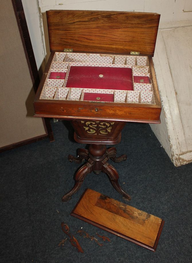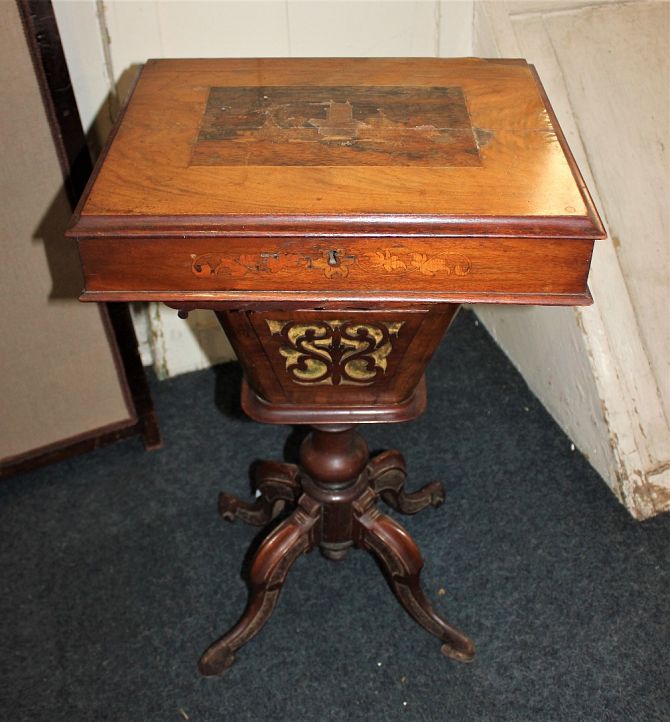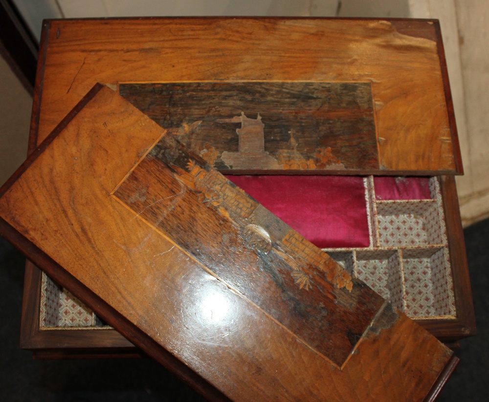 A Victorian inlaid sewing table with fitted interior and silks box on baluster support and four scroll feet, (a/f top in two parts) width 44cm height 70cm