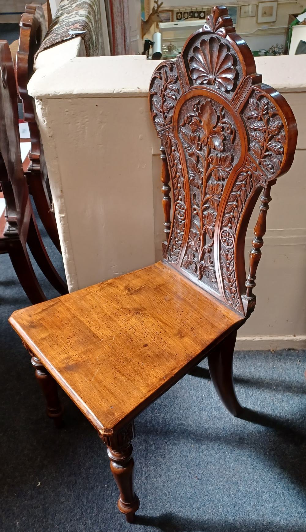 A Victorian carved hall chair, the shaped back with shell surmount above central flower design, on tapered turned legs (a/f)