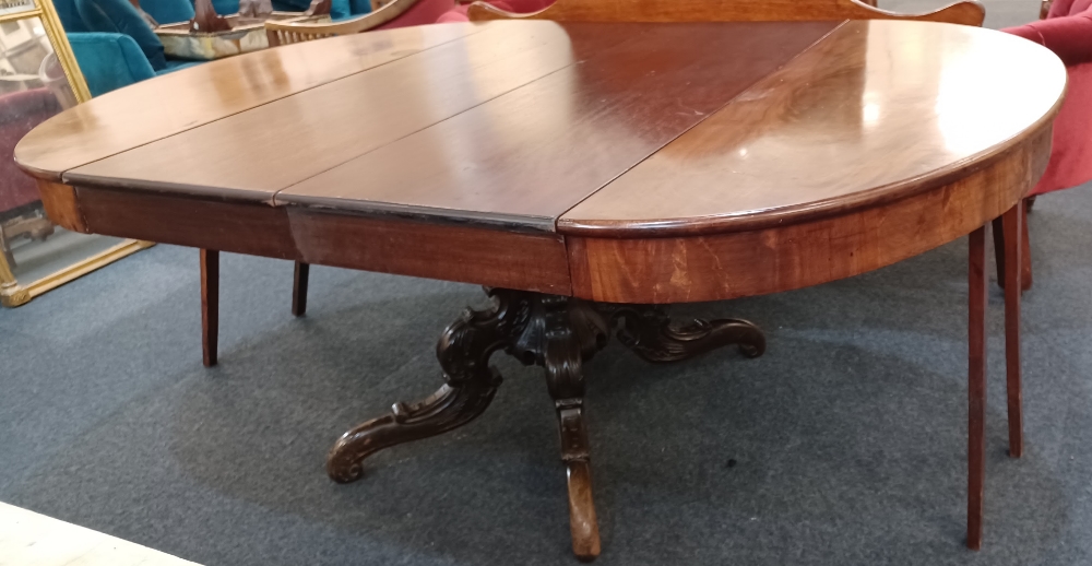 A Victorian mahogany extending dining table with two extra leaves, turned and carved pedestal base on four outswept legs to scroll feet 190cm fully extended