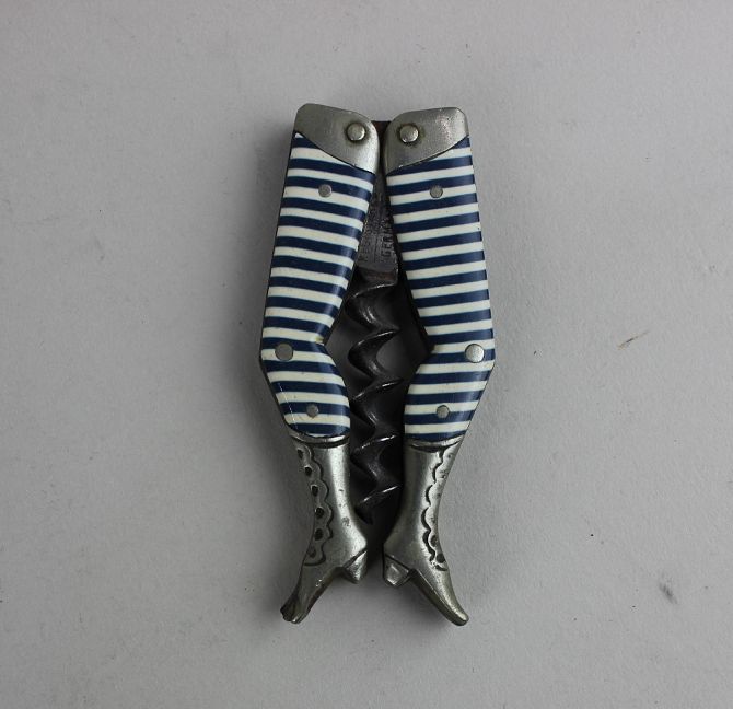 A German novelty ladies legs pocket corkscrew blue striped stockings with bladed worm stamped registered Germany, see Ferd Peters and Bert Giulian, Pocket Corkscrews and Pocket Knives, pp 166-169, 66mm