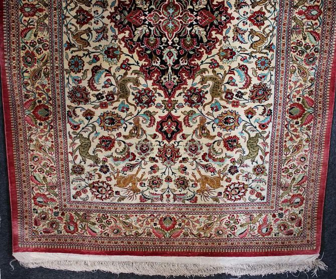 A Middle Eastern hand knotted rug possibly Iranian, signed, cream floral ground with crimson lozenge centre, 103cm by 158cm