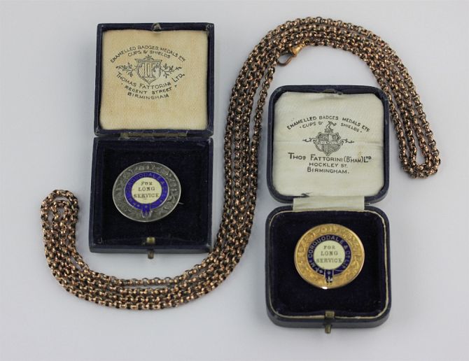 Two McCorquodale Co Ltd enamelled badges for Long Service, comprising the 9ct gold example Birmingham 1935, gross weight 12.2g, the silver example Birmingham 1928, with two cases, by repute belonged to Isabella Charlotte Chantler who was employed by McCorquodale's near St Pancras, London, as a gold leaf book binder in the late 19th/20th century, together with a gilt metal long guard chain fitted with a swivel