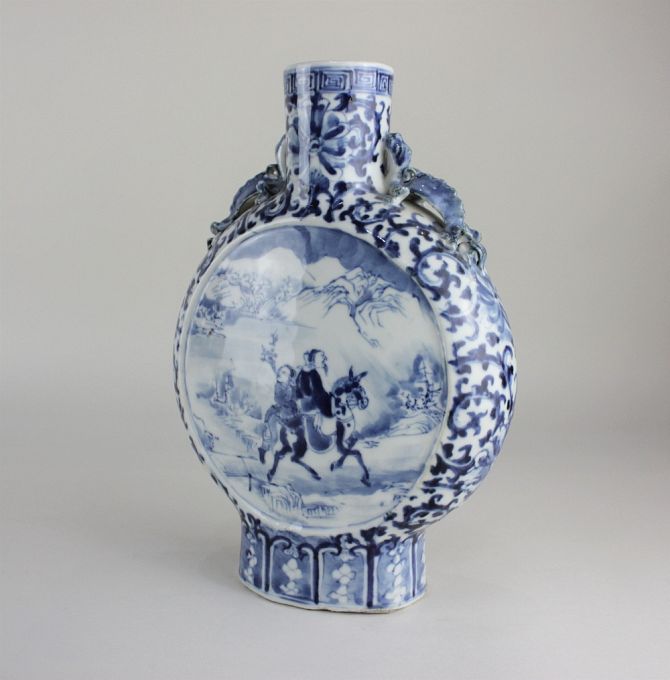 A Chinese blue and white ceramic moon vase decorated with figures on horseback amongst a landscape 26cm high