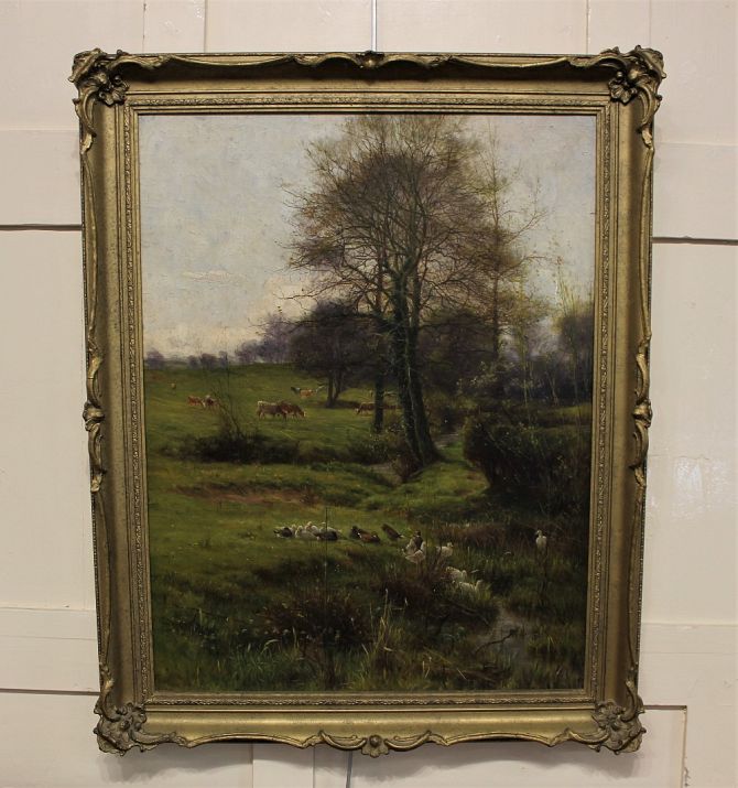 James Hey Davies RCA (1844-1930), rural landscape view of cows and ducks beside a stream, signed, 64cm by 49cm