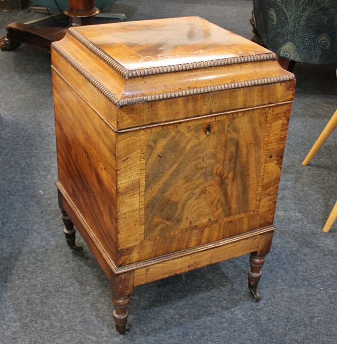 A Regency mahogany wine celleret with inlaid crossbanded square top and gadrooned border, enclosing fitted interior with divisions on short baluster legs with castors, 39cm