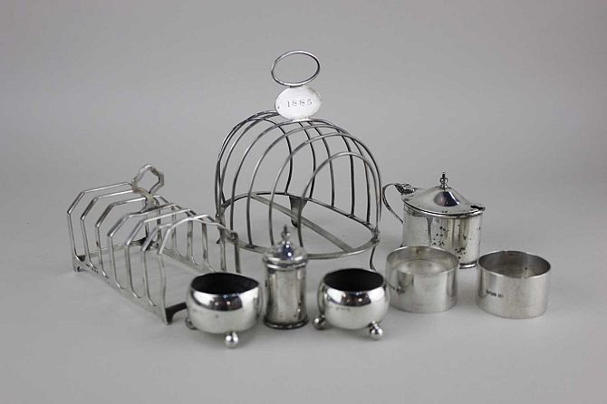A George III silver toastrack six wirework divisions on oval base with engraved initials to hoop handle plate, (a/f) maker GW Chester 1794, 15cm a later silver toastrack, oval mustard pot with blue glass liner, pepper pot, two salts and two napkin rings, one engraved (a/f) weighable silver 12oz
