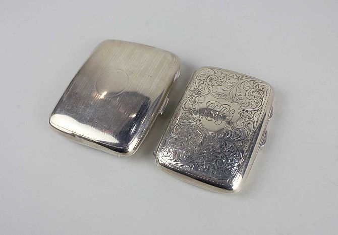 Two George V silver cigarette cases one with engraved scroll decoration and initials, (a/f) 3.5oz