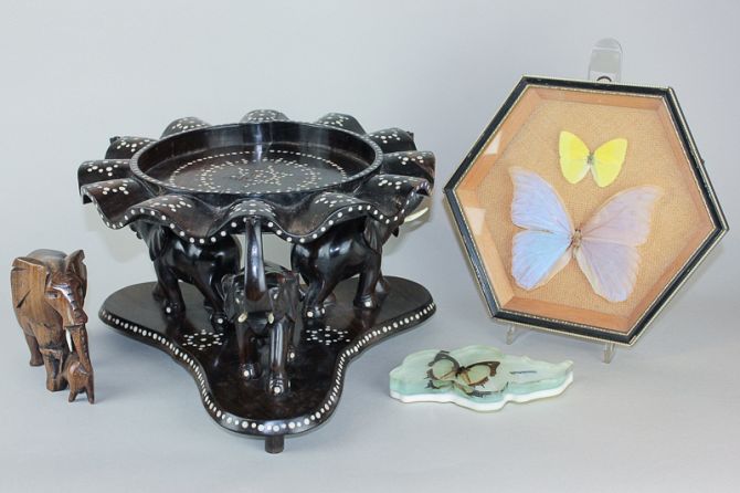 An African hardwood stand supported by three elephants and with bone inlay decoration; together with a case of two moths and a carved elephant ornament