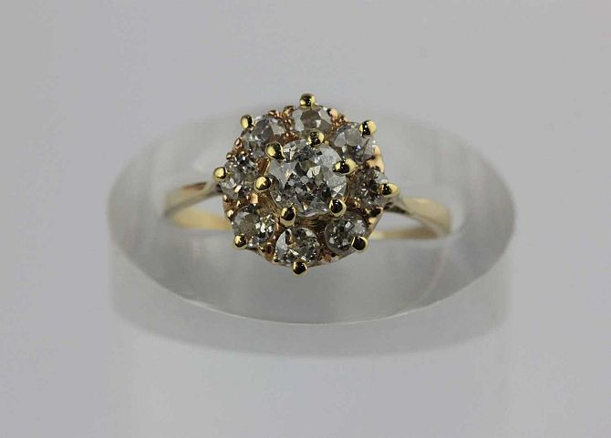 A gold and diamond cluster ring claw set with the principal cushion shaped diamond in a surround of eight smaller cushion shaped diamonds, ring size K1/2, gross weight 2g