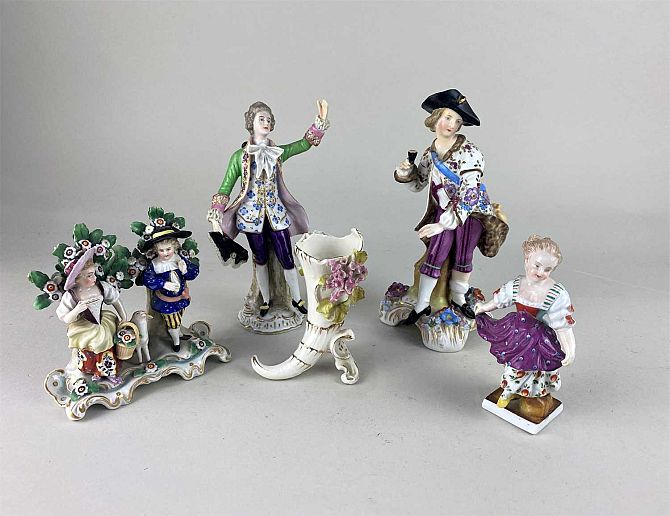 Four various 19th century porcelain figures to include a gentleman in a green tunic and purple breeches 17cm, girl holding her dress and skipping, 11cm and a small cornacopea vase, 10cm