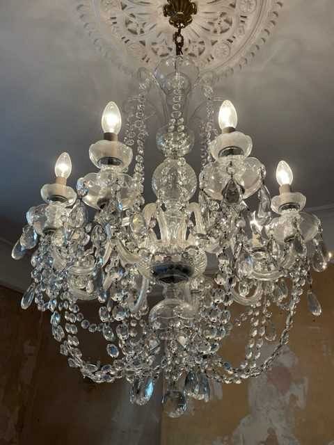 A cut glass eight branch chandelier light fitting with hanging glass droplets (a/f)