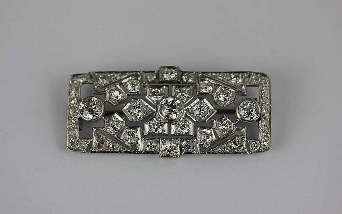 A diamond brooch c1920s in a pierced geometric design collet set with the three principal circular cut diamonds to the centre and otherwise mounted with smaller cushion shaped diamonds, length 4cm, gross weight 10g