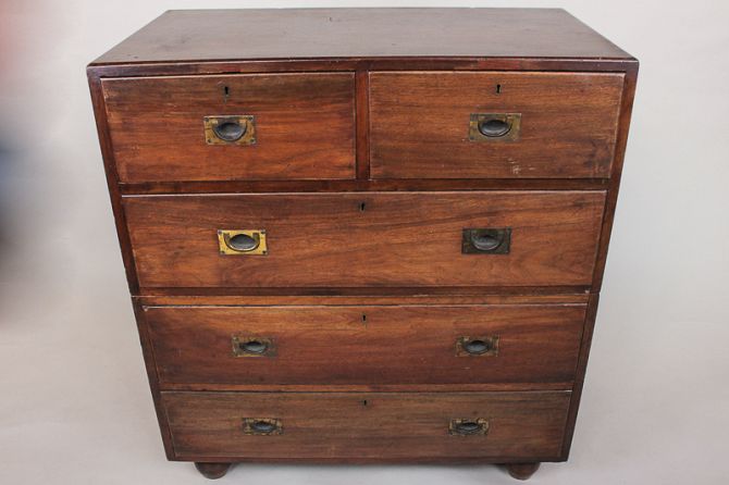 A 19th century military chest of two short and three long drawers (in two sections) with brass inset handles on ball feet, 92cm