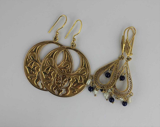 A pair of Egyptian gold filigree drop shaped pendant earrings with lapis lazuli bead and freshwater pearl drops, together with a pair of Egyptian gold earrings of foliate decorated crescent shaped design the tops with wire fittings, combined gross weight 19g