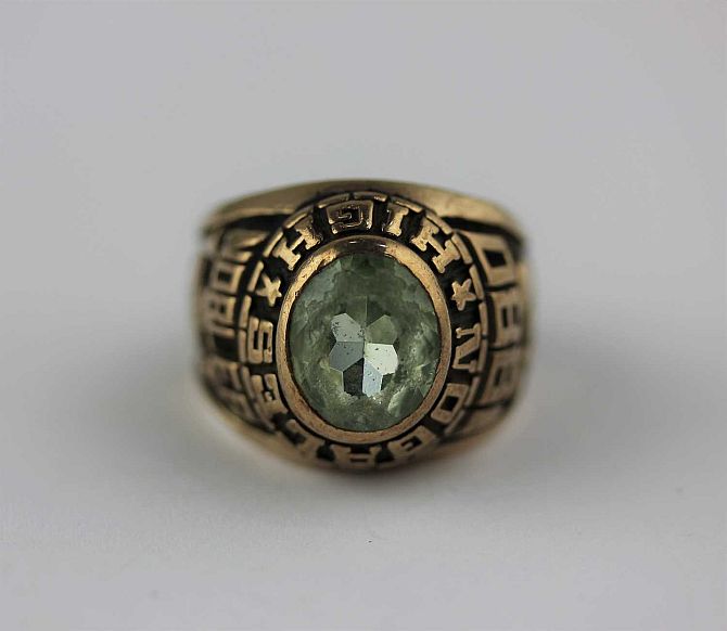 An American gold and pale green synthetic gem set solitaire ring detailed 'NOGALES HIGH 1980 NOBLES', further detailed '10k', ring size R 1/2, gross weight 15.2g