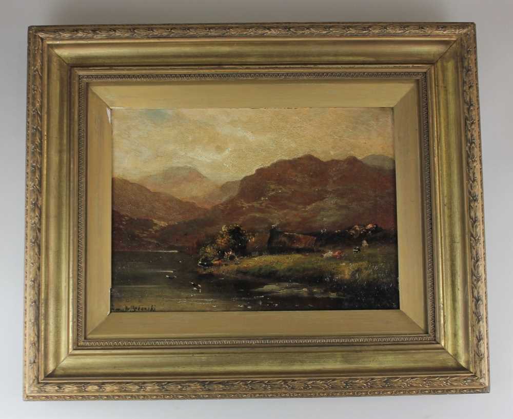 Attributed to Alfred de Breanski, mountainous river landscape view with cottages and cattle in the foreground, oil on canvas, bears signature (over painted), verso faintly inscribed, 23cm by 33cm