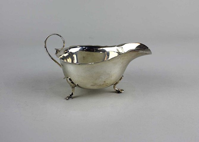 A George V silver sauce boat with scroll handle on three hoof feet, maker Mappin and Webb, Sheffield 1932, 3oz 14.5cm