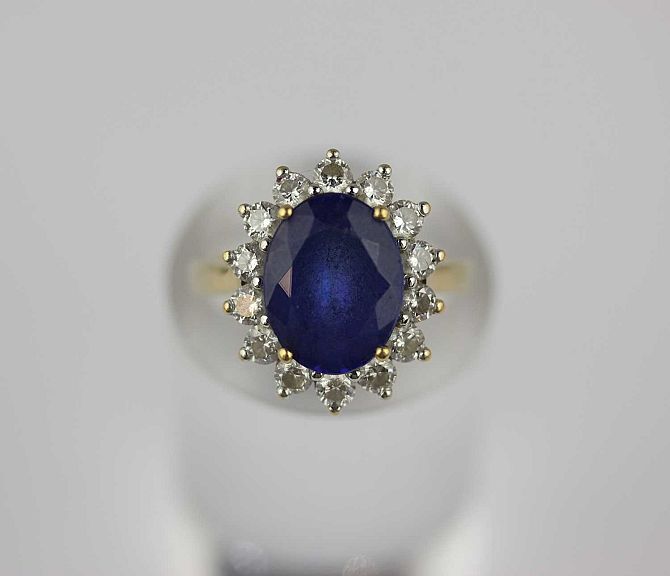An 18ct gold diamond and blue gem set oval cluster ring, claw set with the oval cut blue gem within a surround of circular cut diamonds, detailed '18k Iliana', ring size O, gross weight 7.2g