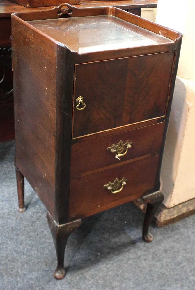 A George III style mahogany bedside cupboard with tray top, cupboard and two drawers, on cabriole legs 37cm