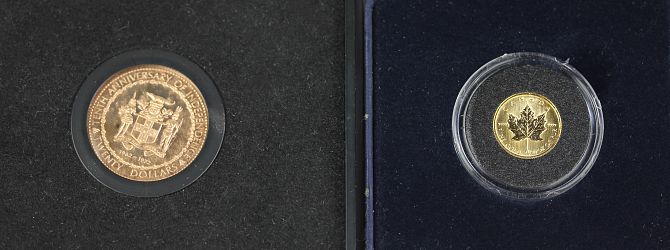 A Jamaica Tenth Anniversary of Independence commemorative gold proof twenty dollars coin in fitted case with card sleeve and a Canada Gold Maple Leaf one dollar coin, dated 1995, in plastic capsule and fitted case