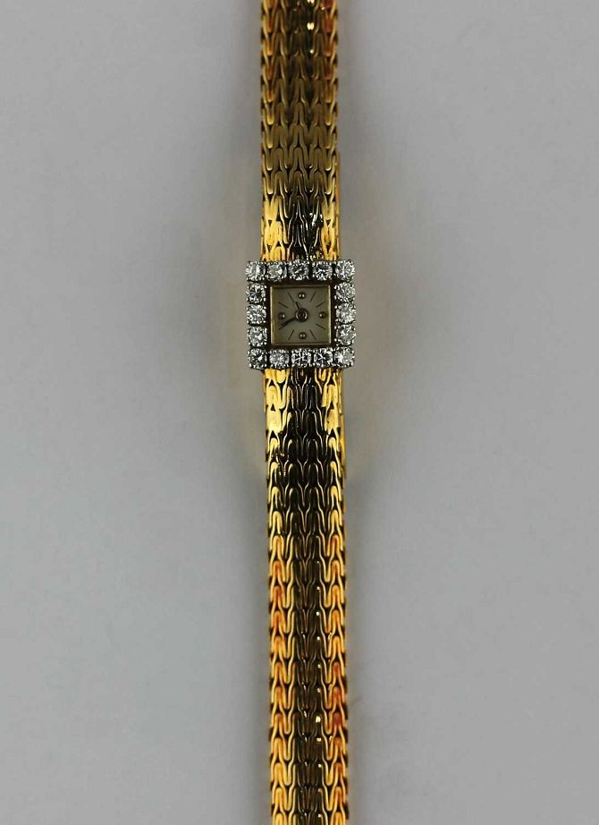 A Vacheron & Constantin 18ct gold and diamond set ladies dress bracelet watch with rear winding mechanism, the small square dial with a surround of circular cut diamonds, the woven mesh link bracelet with a foldover clasp, the signed case back detailed 19.7.71, length 16.5cm, gross weight 33.8g, with a case