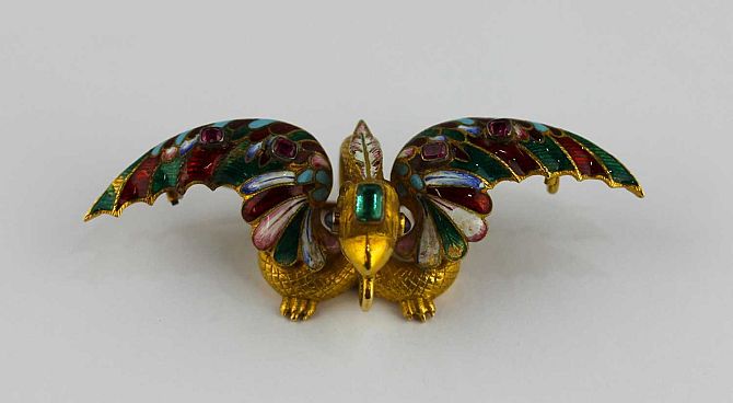 A mid 19th century gold enamelled ruby and emerald set brooch to take a fob watch designed as a mythological bird, the head mounted with a rectangular cut emerald, the wings mounted with two pairs of rubies, otherwise with polychrome enamel decoration gross weight 15g