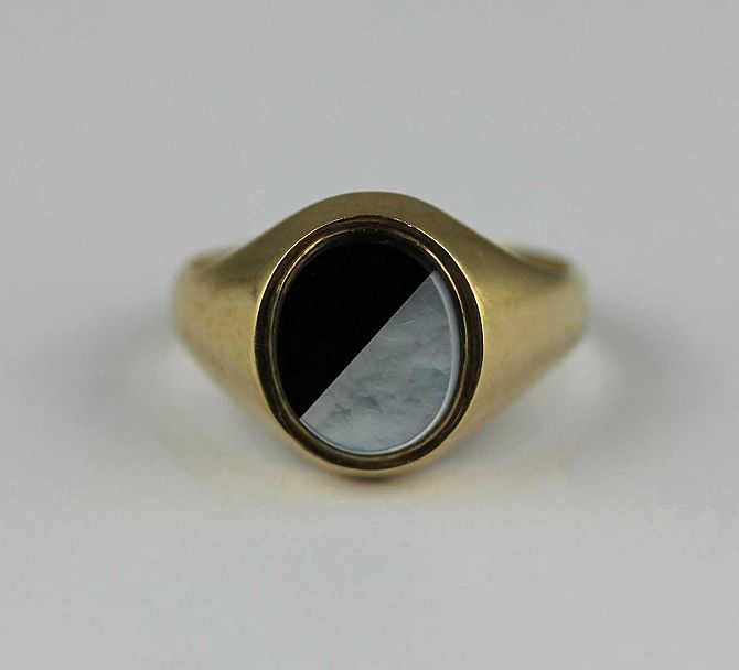 A 9ct gold black onyx and mother of pearl oval signet style ring, ring size U, gross weight 5.8g