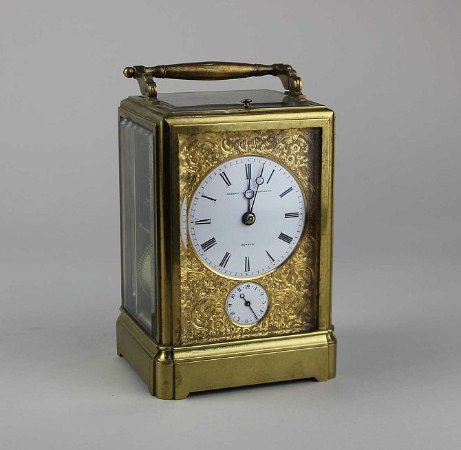 A 19th Century Aubert & Klaftenberger Geneve gilt brass repeater carriage clock with alarm, circular white Roman dial with engraved mask, striking on a bell 16cm high, with key
