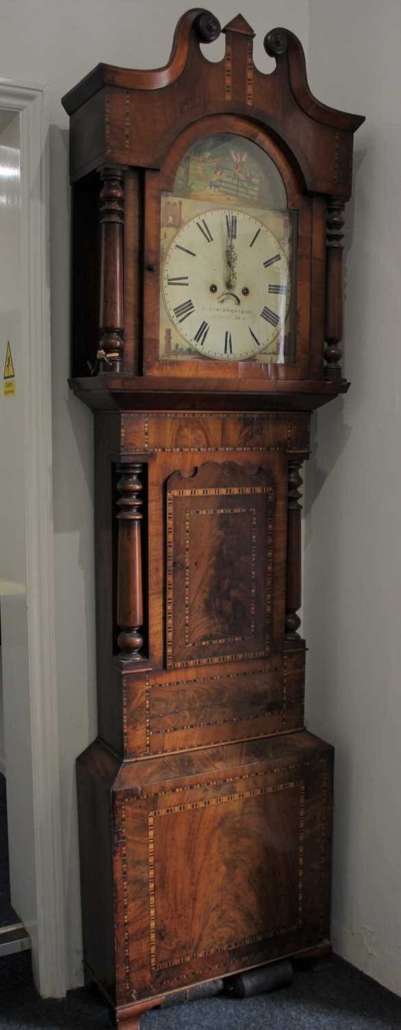A George III inlaid and parquetry banded mahogany longcase clock, with striking and chiming eight-day movement, the painted dial inscribed C Cartwright and Son, Birmingham, and with scene of children playing at a gate, 230cm high, with key, pendulum and two weights