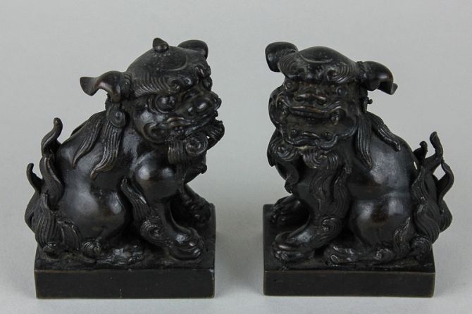 A pair of Chinese bronze ornaments of Temple Dogs seated on rectangular bases, 8.5cm high