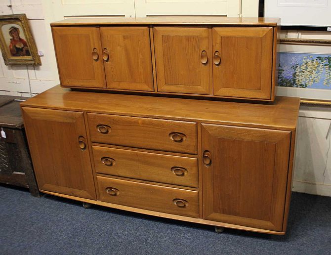 An Ercol sideboard, the top section with four doors, the lower section with three drawers flanked by two cupboard doors on castors width 155cm, height 110.5cm