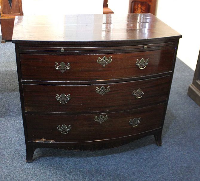 A 19th century mahogany bowfront chest of three graduated drawers below a brushing slide above a shaped apron, on splayed feet 98.5cm (a/f)