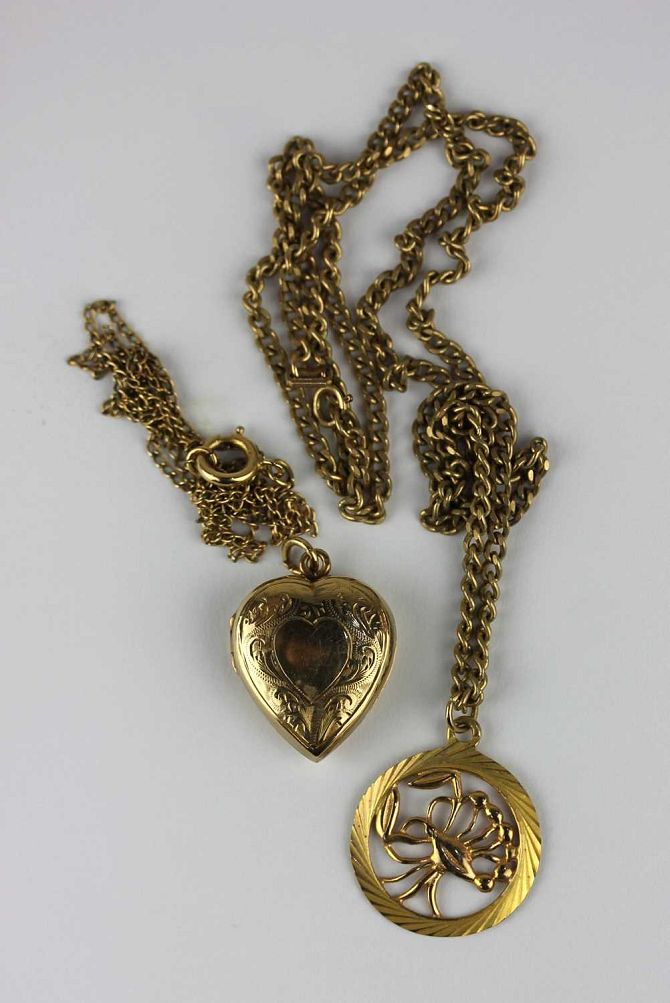 A 9ct gold Scorpio horoscope pendant on 9ct gold neckchain, 9.6g a 9ct gold front and back heart shaped pendant and an unmarked gilt metal neckchain (a/f)