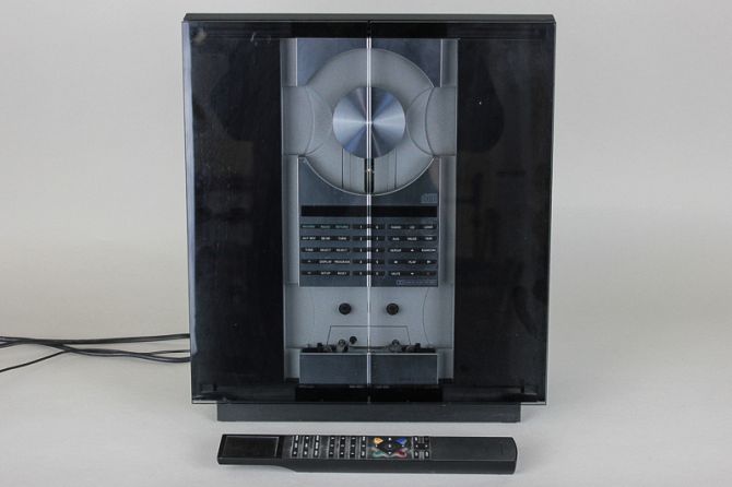 A Bang & Olufsen radio/cassette/CD player with remote control and two 'tower' speakers