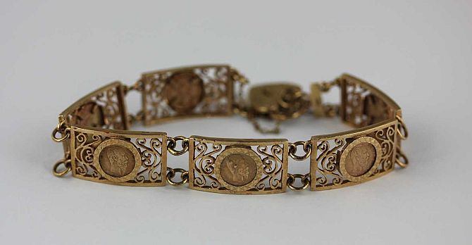 A 9ct gold bracelet in a curved and pierced rectangular design mounted with Peso style coins, with a 9ct gold heart shaped padlock clasp, Birmingham 1975, 23.3g