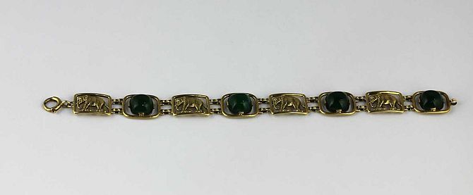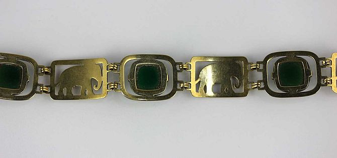 A gold and dyed green agate bracelet, designed as a row of rectangular links pierced with elephants alternating with cabochon green stained agate links, detailed '14k', gross weight 20.7g
