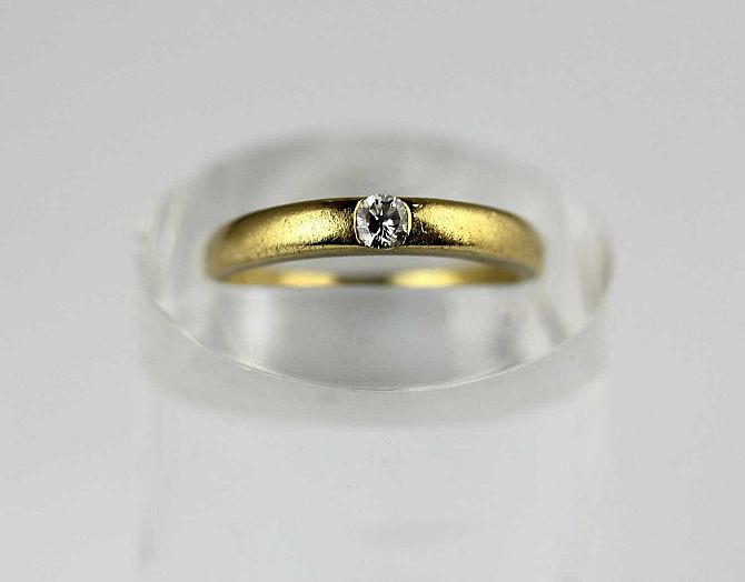 A gold and diamond single stone ring mounted with a circular cut diamond detailed '18k', ring size I, gross weight 2.2g