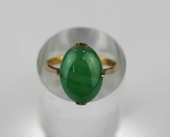 A gold ring claw set with an oval jade, detailed '18k', ring size O, gross weight 3.8g