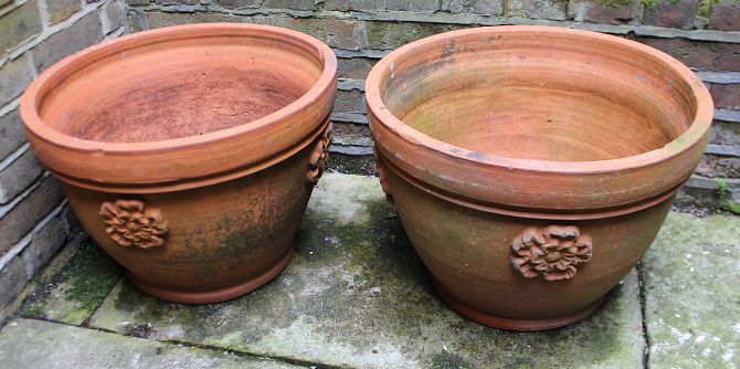 A pair of terracotta garden planters made for the late Queen's Coronation in 1953, both decorated in light relief with four motifs of the Rose of York, 48cm wide and 35cm high on separate biscuit bases