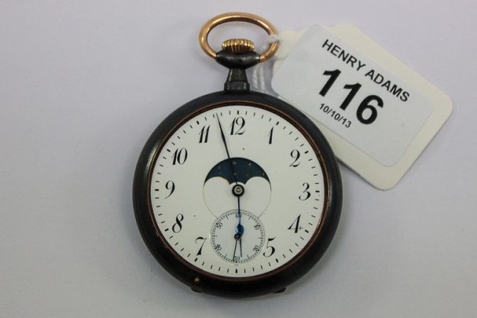 A Swiss gun metal open face watch, white enamel dial with moon phase and subsidiary seconds, the reverse with calendar
