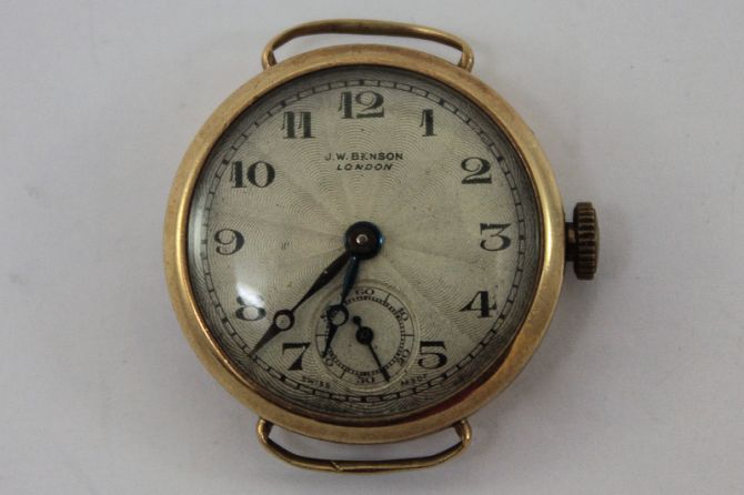A 9ct gold cased J W Benson London wrist watch with circular dial, Arabic numerals and seconds dia