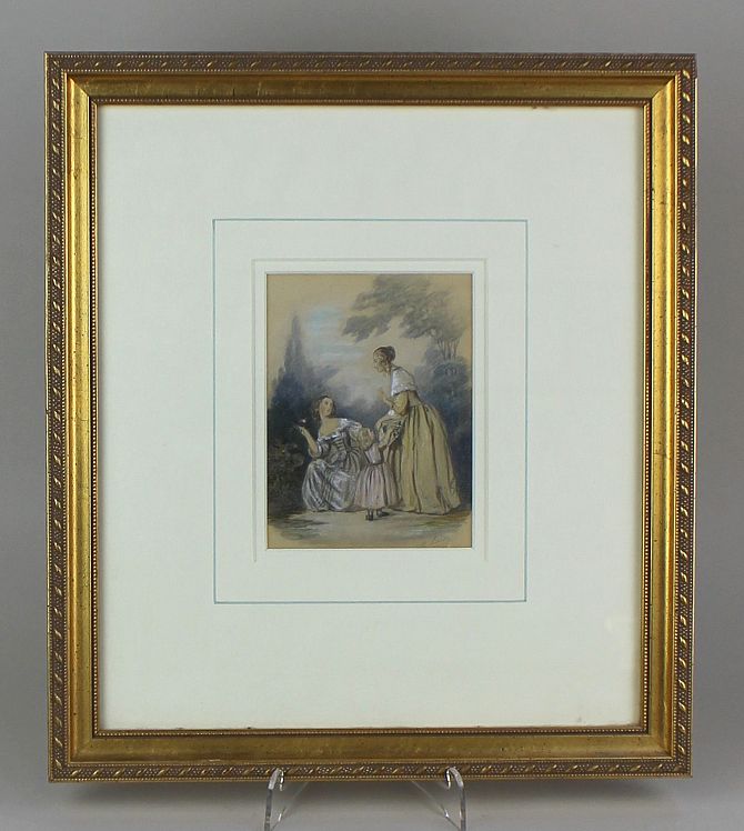 Manner of Annie Rose Laing (Scottish 1869-1946), two women and a child in a garden setting, watercolour, faintly signed * Laing, 14cm by 10cm