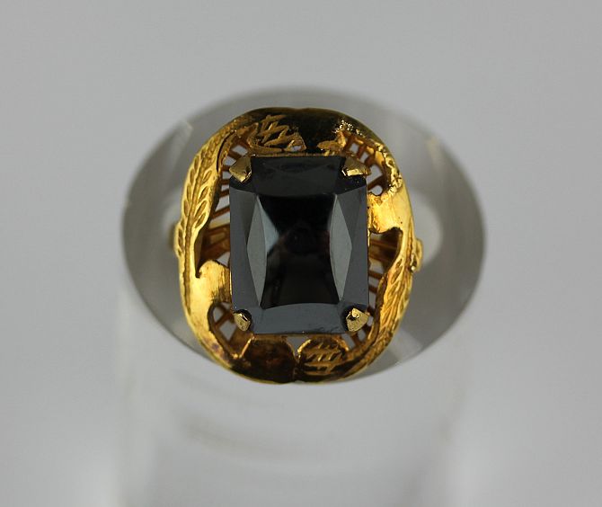 A gold ring mounted with a cut cornered haematite indistinct marks ring size G gross weight 5.4g