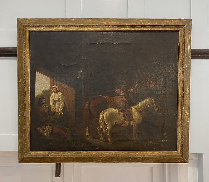Follower of George Morland (1763-1804), inside of a stable with horses and figures, oil on canvas, unsigned, 49cm by 61cm (a/f)