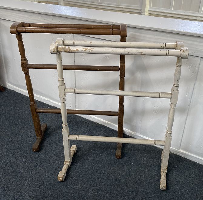 Two turned wooden clothes airers, one painted white, largest 87cm high by 61.5cm wide