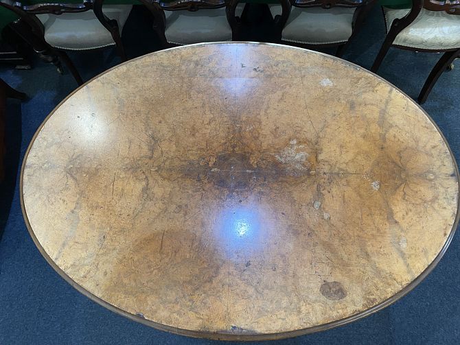 A Victorian walnut breakfast table the oval top on baluster turned stem to four outstretched legs with scroll feet and castors height 72cm, width 121cm